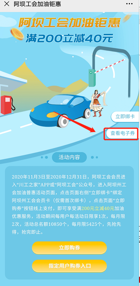 2020年11月3日至2020年12月31日,阿壩工會會員進(jìn)入“川工之家”APP或“阿壩工會”公眾號,進(jìn)入阿壩州工會加油普惠活動頁面,點(diǎn)擊活動頁面右側(cè)“立即綁卡”綁定阿壩州工會會員卡(僅需首次綁卡),點(diǎn)擊頁面“立即購券”按鈕線上支付,即可享受滿200元立減40元加油優(yōu)惠服務(wù)。
